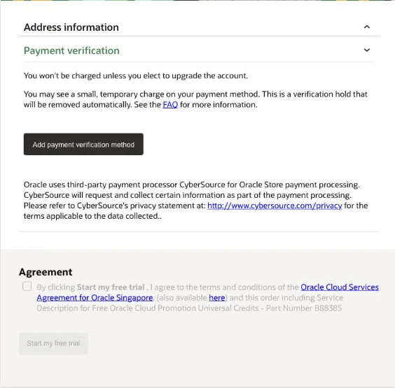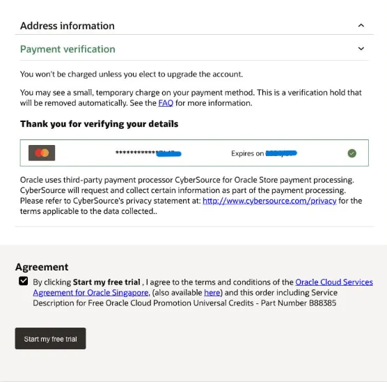 Lưu ý: trong quá trình tạo tài khoản Oracle sẽ charge số tiền SGD 1.85 vào thẻ tín dụng và sẽ hoàn lại vào thẻ ngay khi xác minh thành công