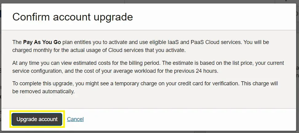 Oracle sẽ yêu cầu xác nhận lại việc nâng cấp tài khoản. Nhấn nút “Upgrade account” để tiếp tục.