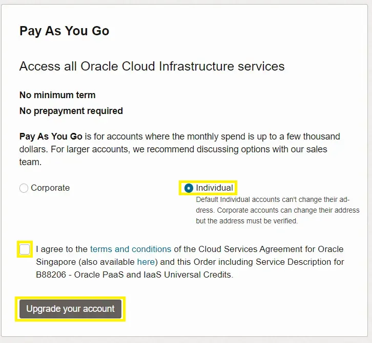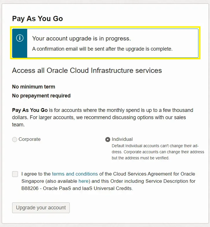 Tiếp tục chọn “Individual”, đánh dấu chọn vào “I agree…” rồi nhấn nút “Upgrade your account”