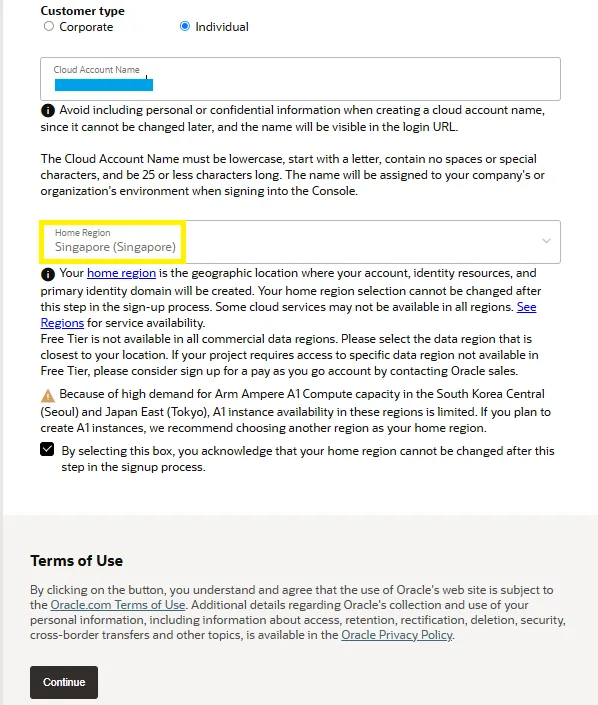 Home Region: vì Oracle chưa có máy chủ đặt tại Việt Nam nên mình chỉ có thể chọn các nước khác ở Châu Á để có tốc độ truy cập từ Việt Nam nhanh hơn. Ở đây mình chọn Singapore (hoặc cũng có thể chọn Korea hay Japan, tuỳ sở thích cá nhân).