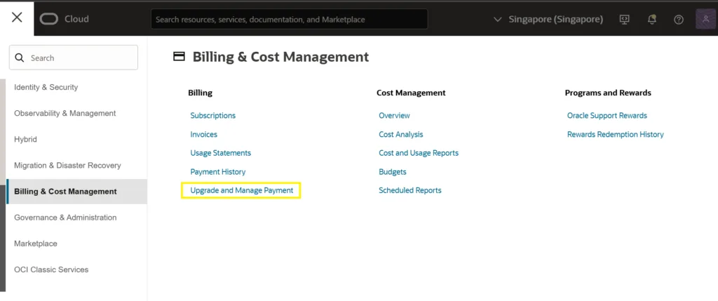 Lưu ý: Oracle sẽ charge vào thẻ số tiền SGD 138 để xác minh và sẽ hoàn lại số tiền này vào thẻ ngay sau khi nâng cấp tài khoản thành công.