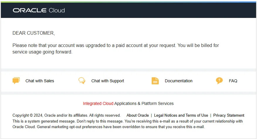 Oracle thông báo việc nâng cấp tài khoản đang được tiến hành và sẽ gởi email xác nhận sau khi hoàn thành.